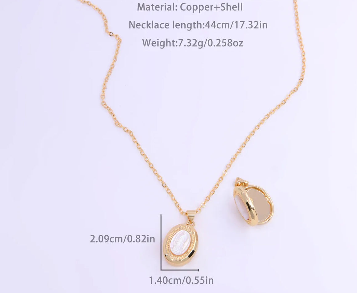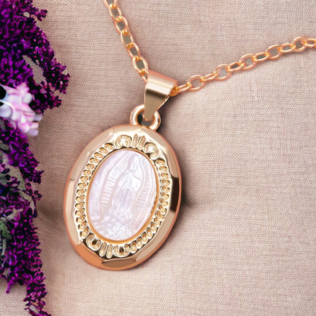 O nosso colar relicário com a imagem da Virgem Maria em madrepérola transcende a sua forma física e torna-se um símbolo vivo da presença divina — uma manifestação tangível do amor e da graça que preenchem os corações de quem confia na sua proteção.